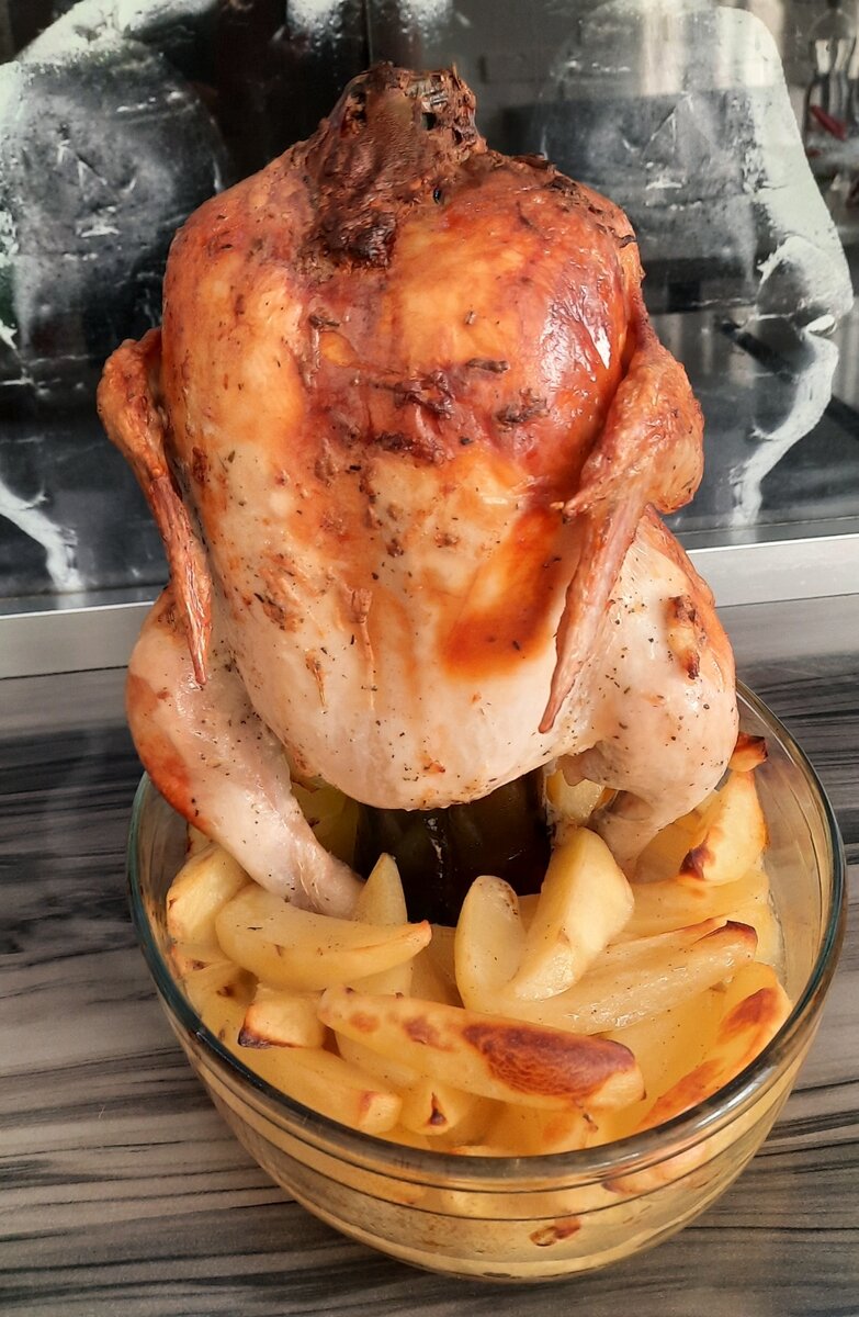 Не знаете что приготовить на обед? Предлагаю вам попробовать курицу в "полёте ", проста в приготовлении и очень вкусная! Вам потребуется: Готовим маринад: смешиваем сметану, измельченный чеснок, соль, перец, прованские травы и чайную ложку масла растительного. Смазываем курицу Убираем в холодильник на час, помариноваться. Подгатавливаем "насест". Снимаем с бутылки с пивом наклейки и тщательно моем пищевой содой. Устанавливаем в форму для выпечки. Спустя час, насаживаем курицу на бутылку. Одновременно с курицей можно приготовить гарнир - запеченную картошечку. Чищенный картофель нарезать на дольки, поперчить, посолить, и чуть-чуть добавить растительного масла - все перемешать и уложить также в форму. Запекать при температуре 170-180 градусов, в течении 1-1.5 часов. Можно использовать режим "конвенция". Приятного аппетита! P.S. в статье использованы фото автора.