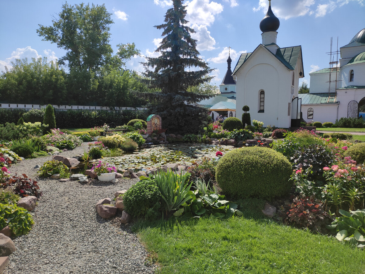 Красивейшая территория ухожена и облагорожена. Дорожки соединяют храмы, плодовый сад, огород, прудик с лотосами, мини — зоопарк и цветники.
