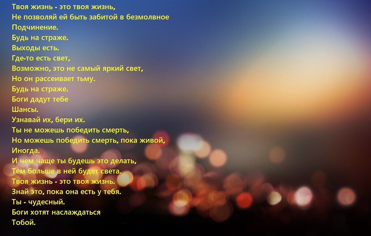 Каждый день жизнь посылает нам множество позитивных сообщений, которые могут поддержать в трудную минуту. Для кого-то это может быть жизнеутверждающая театральная постановка, кто-то услышит песню с нужными словами или прочитает стихи. А калифорнийский психолог Пит Уокер в главе о техниках самопомощи, которые необходимо развивать людям в терапии, упоминает следующее граффити, которое увидел на улицах родного города. Тепла и гармонии, ~ Екатерина