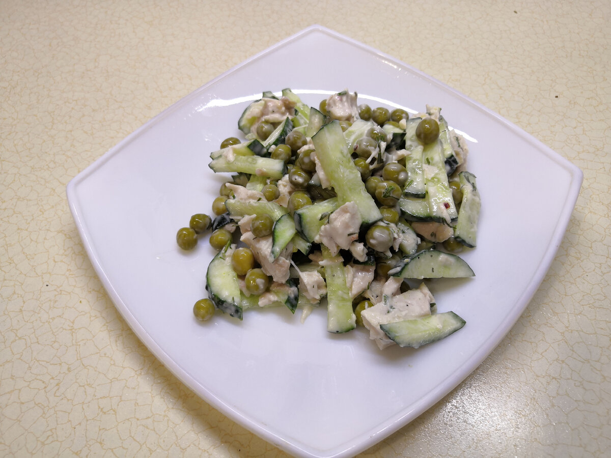 Ингредиенты: Шаг 1 Куриную грудку отварить. Остудить и нарезать. Огурцы нарезать, из горошка слить жидкость. Зелень накрошить. Смешать все в миске вместе с солью. Шаг 2 В сметану добавить горчицу, перец и итальянские травы, перемешать. Добавить к овощам с курицей. Перемешать. Салат готов!