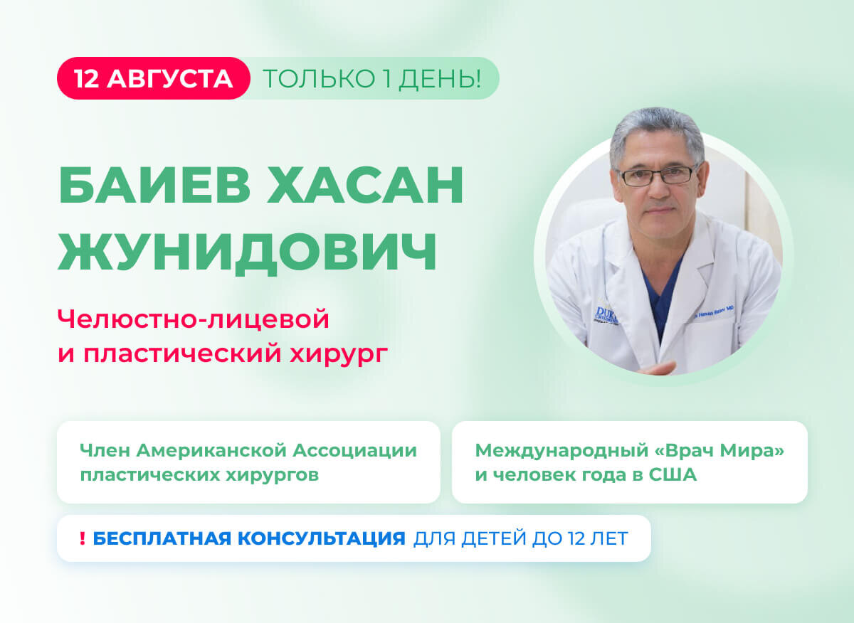 Уважаемый жители и гости республики! Только один день, 12 августа в поликлинике медицинского центра "Целитель" в Махачкале будет вести приём известный челюстно-лицевой и пластический хирург с многолетним стажем практической работы Баиев Хасан Жунидович. О враче Баиев Х. Ж. является специалистом, заслуженно завоевавшим мировую известность. В 1985 году окончил Красноярский медицинский институт по специальности челюстно-лицевая хирургия. А уже в 2001 году доктор начал Международную практику. Он проводил сложнейшие операции, читал лекции и проводил консультации в лучших мировых медицинских клиниках. Его международная врачебная деятельность была высоко оценена вручением в 2005 году престижной премии " Врач мира". Хасан Жунидович - единственный из россиян в постсоветском пространстве, удостоенным столь почётного звания. Долгие годы проживая и работая в Америке, Х. Ж. Баиев создаёт благотворительный фонд для помощи малообеспеченным семьям из родной Чечни, а также детям из беднейших стран Ази