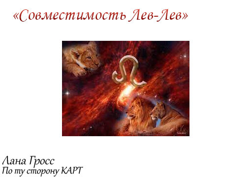 Лев-Лев Интересная пара, можно сказать, любопытная. Главное, редкая и дающая повод для поучающих сентенций. Генерал без армии, вернее, два генерала. Король и королева без слуг, прислуги и почитателей. Это не жизнь, а сказка. О том, «Как один мужик двух генералов прокормил». Только без мужика. Львы стремятся к свободе самовыражения, у них столько воли и внутренней силы, что они не могут умерить сие стремление. Так что в этой паре тщеславия, а тем паче гордости и самомнения более чем достаточно. Но вы знаете, что бывает, когда актер становится поневоле зрителем? Кто лучше поймет актера, нежели не сам актер? Кто отметит все недостатки пьесы? В общем, увидит все прелести своей персоны, наблюдая за театральными позами выступающего? Надолго Львов может и не хватить, ведь не все в жизни театр и праздники. Есть и будни. Одним словом, с житьем-бытьем в свое удовольствие в безбедной жизни у этой парочки все в порядке. Но когда приходит черед прозы жизни, каждый продолжает говорить стихами и раб