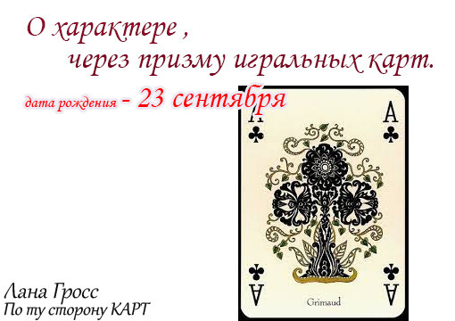 Дата рождения – 23 сентября , карта рождения – Туз треф Карта Туз треф - Число 1- символизирует Солнце. Первое из всех чисел – основание, на котором все покоится. Поэтому оно является главой семьи чисел. Люди, родившиеся в этот день, творческие и изобретательные натуры. Они твердо держатся своих взглядов и обладают огромной силой убеждения. Поэтому они не очень любят ограничения и непрошеные советы. Они предпочитают трудиться в одиночку, независимо от других, будь то равные или подчиненные. Все это вместе взятое делает их мини– (а иногда и макси–) диктаторами. Эти люди весьма амбициозны и обладают огромной решимостью и силой воли, которая в действии проявляется как упрямство и своенравность. Ребенок, родившийся под тузом, не успокоится, пока его требование не будет удовлетворено, и для того, чтобы сделать по-своему, он перевернет все вверх дном. Таким людям необходимо тактичное обращение. Люди, родившиеся в этот день, поднимаются на самый верх карьерной лестницы, если окружение дает