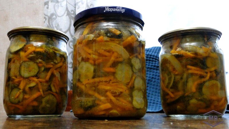 Салат с морковью и огурцами по-корейски на зиму легко приготовить из летнего урожая огурцов. Салат с огурцами и морковью получается в меру острым, с приятной ноткой вкуса. Ингредиенты (на 4 банки по 0,5 л): 1 кг огурцов, 400 грамм моркови, 300 грамм болгарского перца, 50 грамм чеснока. Заправка: 120 мл растительного масла, 65 грамм сахара, 30 мл уксуса, 20 грамм приправы для моркови по-корейски, 1 столовая ложка с небольшой горкой соли. Процесс приготовления: Огурцы нарезаем кольцами, морковь натираем на тёрке, болгарский перец – соломкой, чеснок – тонкими пластинами. Соединяем овощи в глубоком тазу. Готовим заправку. К маслу добавляем чеснок, приправу, соль, сахар и уксус, перемешиваем. Переливаем массу к нарезанным овощам. Перемешиваем, чтобы овощи пропитались заправкой. Накрываем крышкой или тарелкой и ставим под гнёт на 4 часа, чтобы из овощей выделился сок. Распределяем салат по стерилизованным банкам. Сок, что выделился при давлении гнёта, переливаем также в банки. Накрываем