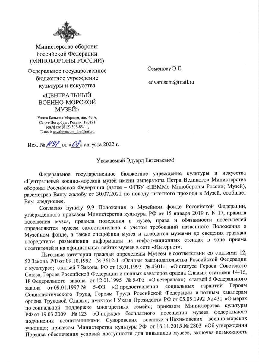 Да простят меня мои читатели за занудство, но обещаю на этом все. Больше не буду. Пришло еще одно письмо из военно-морского музея, где мне попытались объяснить, почему моей жене не продали льготный билет при предъявлении социальной карты. Не вдаваясь в подробности там есть много российских законов, но в итоге снова все свелось к иным документам и подзаконным актам, номера и даты которые так и не были предъявлены. То есть предлагалось поверить на слово. Что характерно? Все названные в письме законы РФ, совершенно не касаются пенсионерам, и удостоверяющих документов. Мало того, объясняя мне, в чем я не прав, сами же написали, что социальные карты могут быть и у школьников и студентов, которым как раз положена льгота при посещении музея. Но да бог, с ними. Самое интересное, что недавно мне рассказали о том, что в музей можно не попасть даже при предъявления пенсионного удостоверения. Собеседник поведал, что кассир после предъявления пенсудостоверения потребовал предъявить еще
