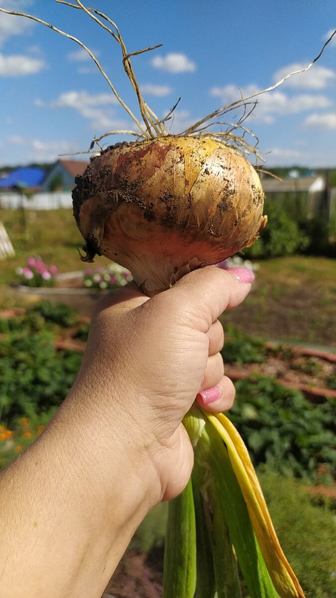 Уже пора копать)! ▪️Но за пару недель до этого момента, землю вокруг головок у лука и чеснока отгребаю, чтоб часть была на поверхности, на солнышке. Так они нальются и станут крупнее 👍 Хотя сроки выкапывания у всех разные. У меня срок для этого старый и неизменный - когда лопнула бульбочка, тогда и копаю (когда конечно же не льют дожди). Выкапываю всё и сразу 🙌 Не трогаю только лук порей☝️ ▪️Выкапываю одновременно чеснок, лук, тюльпаны, нарциссы, декоративные луки. ▪️Всё раскладываю на веранде (не на солнце!) и два-три дня просушиваю. ▪️Затем очищаю от земли, убираю корни, старые чешуи и сортирую: что на осеннюю посадку, что на хранение. Из-за погодных казусов на чеснок больших надежд не возлагала... А зря, крупный, но уж очень сильно его утянуло вглубь, землю было не отодвинуть. Так и просидел он у меня в полном мраке до самого выкапывания). Но вышел хорош 🤗 Сажаю только озимый чеснок, мне так удобнее и проще. Отбираю самые крупные зубчики чеснока для посадки. От размера посадоч