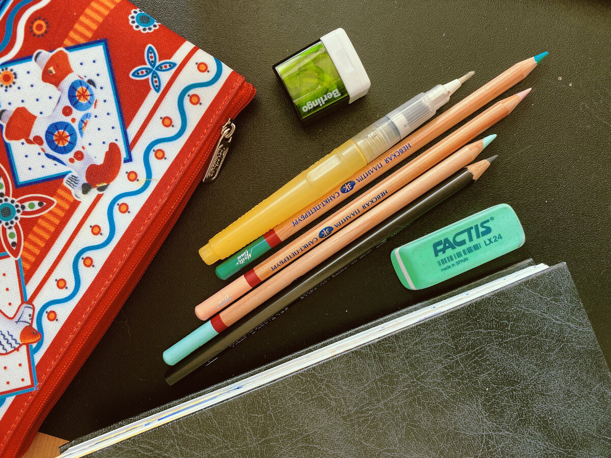 Обычно беру с собой до пяти карандашей. Предпочитаю быстрые зарисовки, большая палитра мне не нужна. Я редко работаю с натурным (приближенным к реальному) цветом, поэтому цвет карандашей выбираю по настроению. Иногда вытягиваю их, не глядя, это усложняет задачу, но и делает ее интереснее.