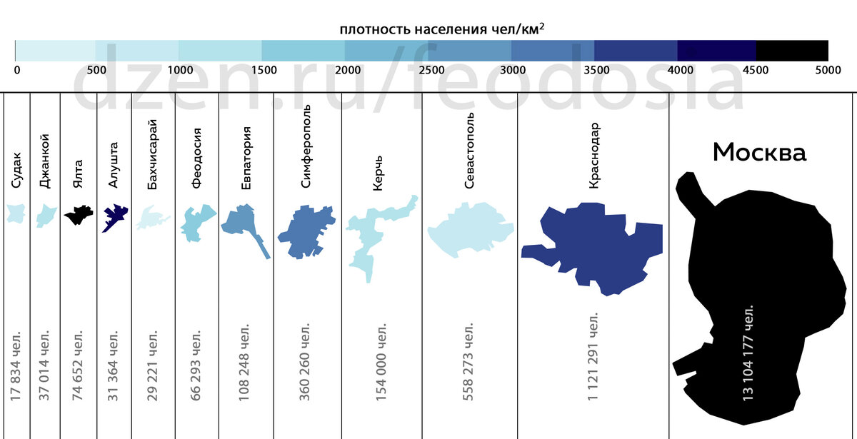 Друзья, я для этой статьи провел много времени в поиске информации и рисуя инфографику, поэтому буду признателен вам за лайк и комментарий. Погнали. 1. Размер и плотность населения. на этой схеме видны размеры Феодосии относительно других крымских городов, а также Краснодара и Москвы и их густозаселенность.. Чем темнее тем больше людей на квадратный километр. В Феодосии относительно небольшая плотность населения, где-то 1990 человек на километр квадратный. В Москве самая большая плотность населения 5000 человек на километр квадратный. а самая маленькая плотность в Бахчисарае, там всего 67 человек на квадратный километр. С