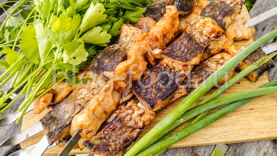 Всем привет. Давно хотели приготовить какую-нибудь речную рыбу на углях. Форели, сибасы, дорадо и иже с ними, конечно, хорошо, однако овёс нынче дорог, а тут по случаю прикупили несколько карпов в Глобусе по какой-то акции. Недорого, уже потрошённые — ешь, не хочу! Порылись в сети, нашли интересный маринад, и вперёд! Единственный момент, который стоит учитывать — вес рыбы. Нам достались маленькие по 0,6 кг, однако, чем больше, тем лучше — и готовить удобнее и мяса побогаче ). Продуктовый набор: Если рыба неразделанная, вычищаем внутренности, снимаем чешую. Голову, хвост и плавники отрезаем. Далее либо делаем филе на коже, поделив его потом на кусочки по 3-4 см, либо тушку нарезаем поперёк, удаляем хребет и оставляем рёберные косточки (они крупные и особых проблем не доставляют). Лук режем полукольцами, слегка мнём руками. Добавляем томатный сок, аджику, солим по вкусу, перемешиваем. Заливаем рыбу маринадом и оставляем на час-полтора. Нанизываем на шампуры... ...жарим по паре минут на к