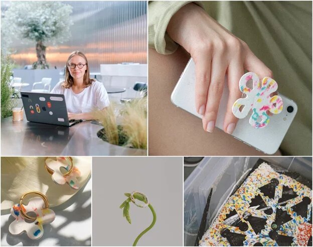 Трогательные цветочки, ракушки, сердечки, звездочки, буквы и смайлики. Все разные, оттенки цвета переходят один в другой и никогда не повторяются. Серьги, кольца и подвески. Двух одинаковых изделий не найти. Всё потому, что создают их из переработанного пластика и узор формирует термопресс. Дизайнер просто выбирает цветовую гамму. Полина Черповицкая, архитектор по образованию, несколько лет весьма успешно сотрудничала со многими российскими и зарубежными музеями - делала для них сувениры из акрила. Но тут грянула пандемия и карантин. Музеи закрылись, едва не похоронив бизнес Полины. Как всегда, помогла случайность. Мастерская получила заказ на изготовление сувениров для одной из крупных компаний, однако главным условием было использование переработанного пластика. Подходящий материал нашли в студиях 3D-печати. Там их приняли с распростертым объятьями, поскольку самим заниматься утилизацией было крайне невыгодно. Заказ был исполнен, а из остатков материала Полина сделала для себя нескол