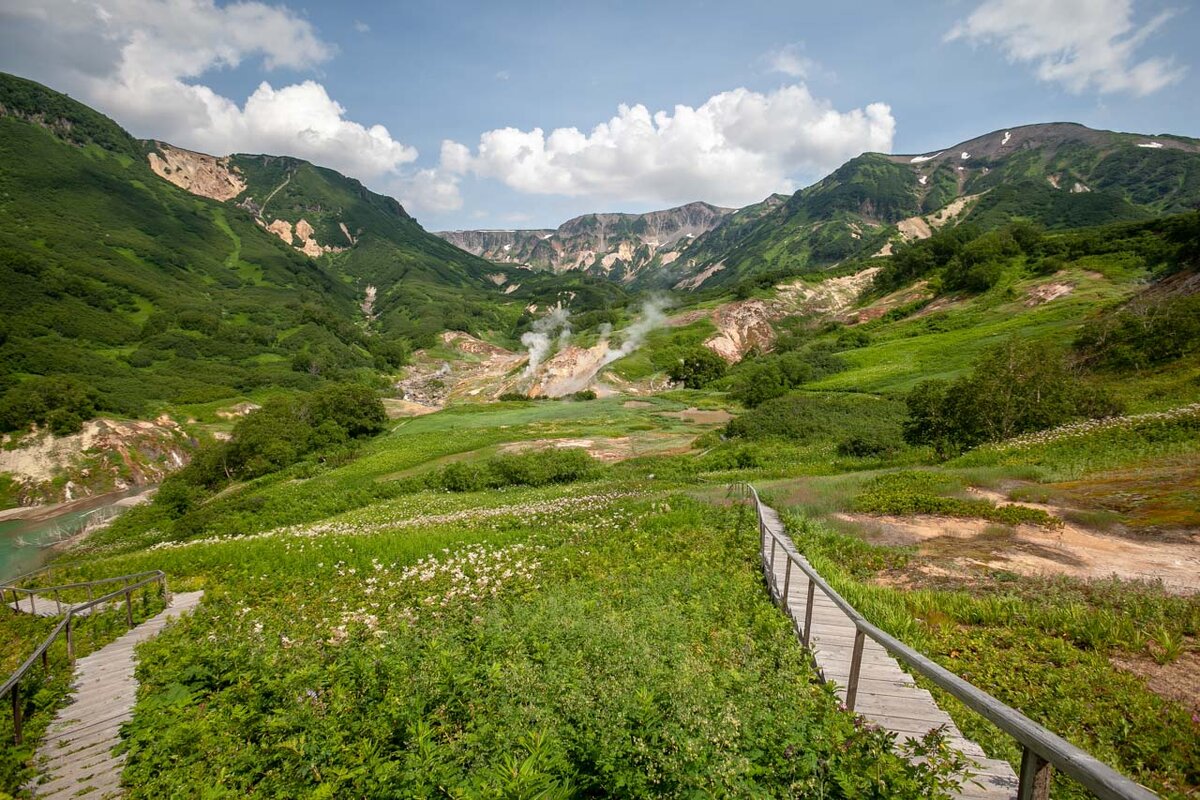 Наконец, мы сели. Кажется, будто что-то случилось с глазами и цветопередачей — таких оттенков не бывает в природе! Здесь бы вместо «Земли Санникова» снимать сказки: синее небо, зеленое ущелье, озеро бирюзы, песчаные отмели и откосы с ярко желтыми, багровыми и красными подтеками. Три избушки и петляющие по долине деревянные настилы-дорожки. Почти сказка, если бы не звуки и запахи. Долина не унимаясь булькает, шипит, дымит, вскипает и извергается кипятком гейзеров, как большая кухня или прачечная.