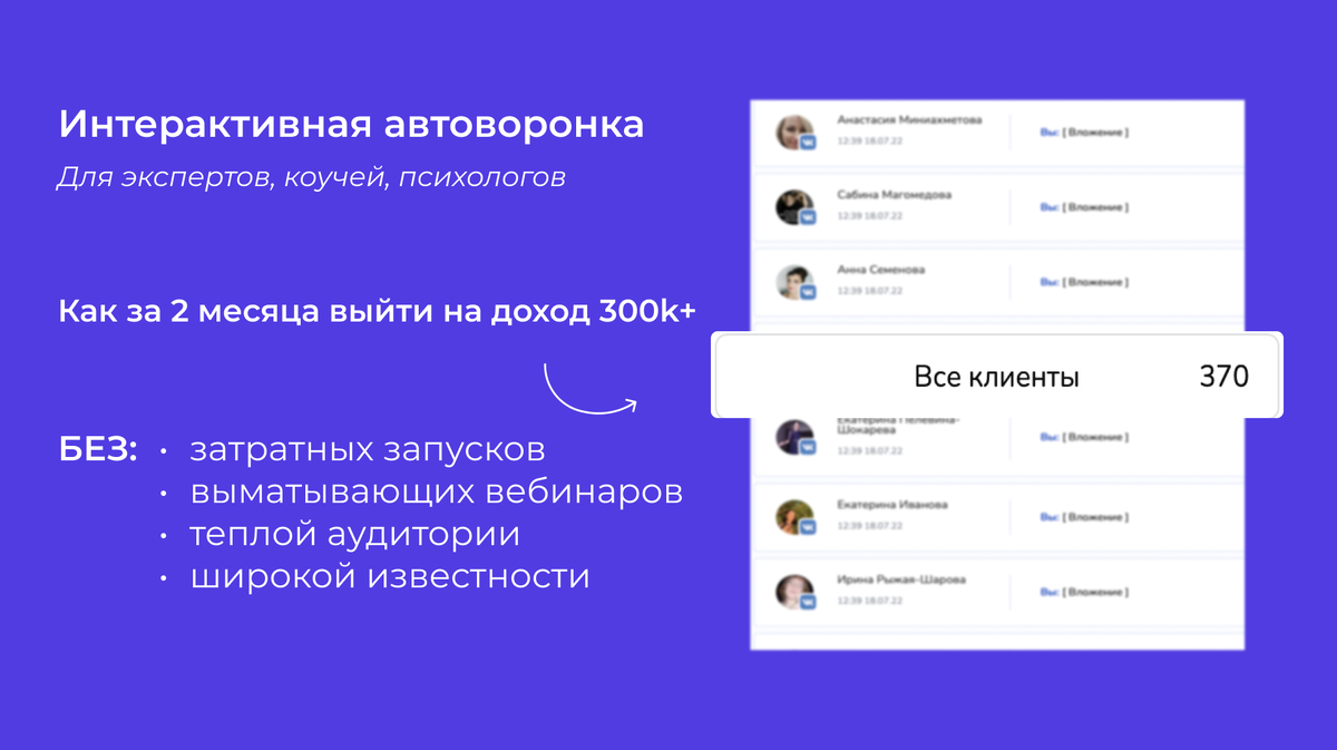 Как эксперту, коучу, психологу за 2 месяца выйти на доход 300+ с помощью интерактивной автоворонки, без затратных запусков, выматывающих вебинаров, теплой аудитории и широкой известности.