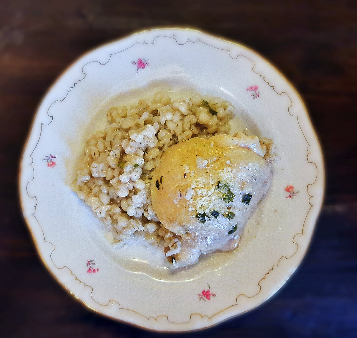 Сегодня у меня насыщенный день и совершенно нет времени на кулинарные изыски, а кормить семью — надо. Поэтому я беру себе на помощь медленноварку. Заряжаю на несколько часов и занимаюсь своими делами. Просто, вкусно, как из печи в горшочке. Ингредиенты. Приготовление. Перловку замачиваем на ночь: промываем, заливаем водой. Замачивать можно до 10-12ч. Утром еще раз промываю перловку, выкладываю на дно чаши, кладу лаврушку, мелко рубленные чеснок и зелень, сверху бедра, которые посолила и поперчила отдельно, все заливаю 2-мя стаканами соленой воды со специями, накрываем крышкой и ставим на режим LOW на 4 часа. У меня чуть раньше приготовилось. При подаче посыпать крошкой пармезана и зеленью.
