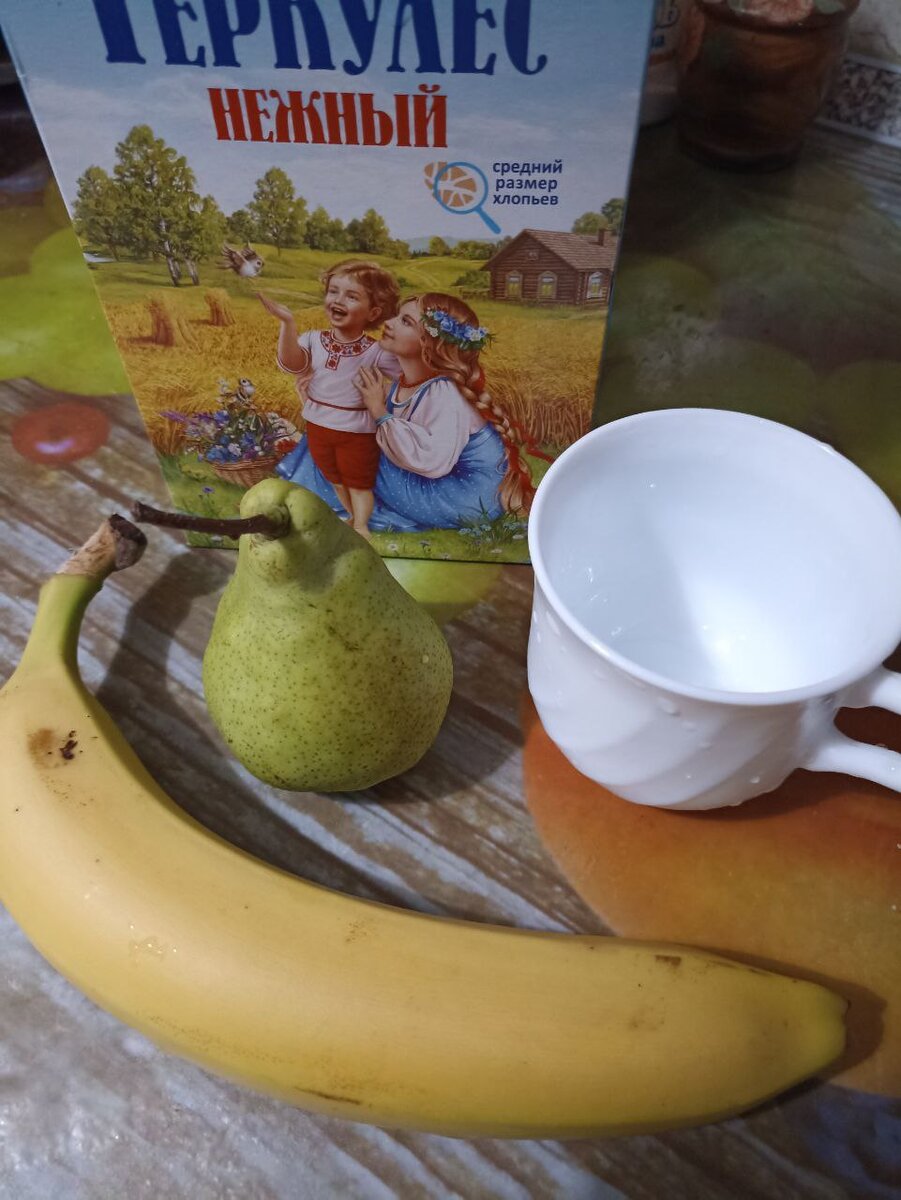 Итак. Берём маленькую чашку (или используем половину большой) как мерку, пачку геркулеса или овсянки, банан, грушу и воду.
