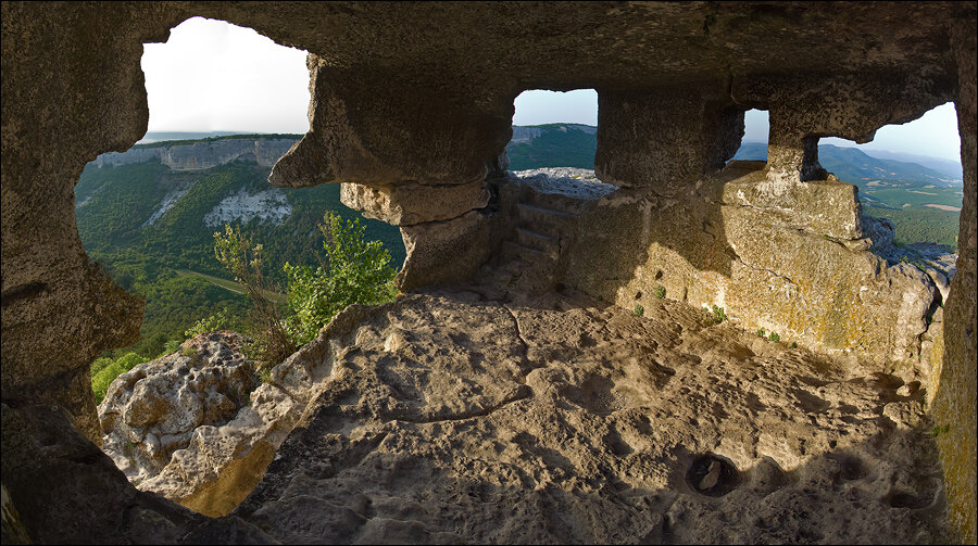 Мы же вылезем из скального монастыря, ещё раз полюбуемся бескрайним простором с отвесного обрыва Дырявого мыса, да обратим внимание, что на небольшой треугольной в плане площадке, расположенной на самой оконечности мыса, заметны высеченные в скале «постели» для каменной кладки. Здесь когда-то возвышалась башня, которая являлась частью сложного дозорно-оборонительного комплекса, от которого сохранились только внутрискальные помещения, а это — целый комплекс пещер, своеобразная визитная карточка Мангупа.