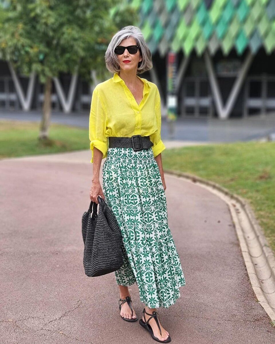- Не стоит бояться ярких красок, но необходимо выбирать оттенки, которые вам идут. Для создания стильного образа использована рубашка лимонного оттенка и длинная плиссированная юбка с принтом в бело-зеленых тонах. Талия подчеркнута широким кожаным ремнем.