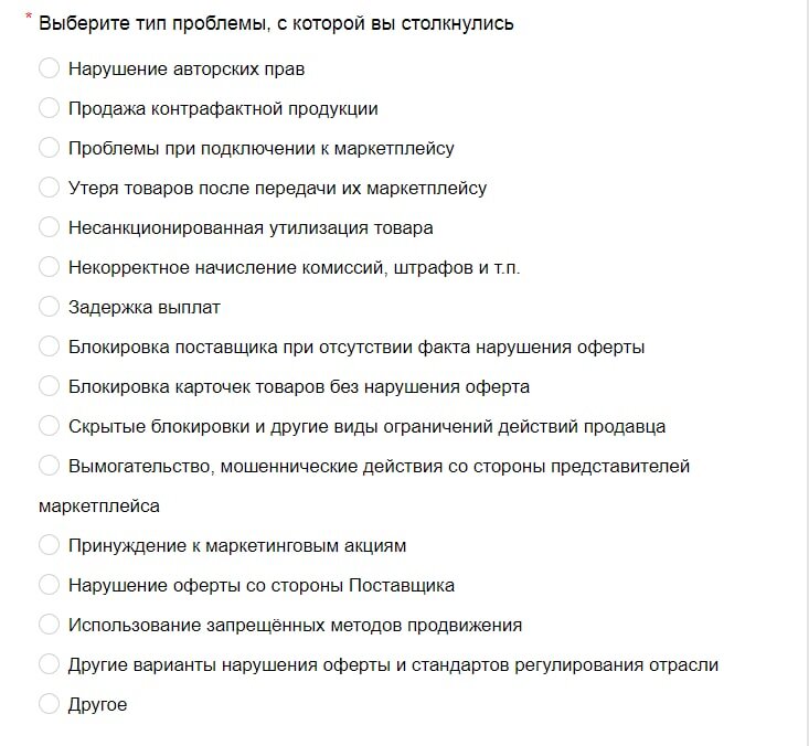 Отправить обращение в Комиссию можно через специальную форму — нужно будет подтвердить, что заявитель ранее обращался к площадке и либо не получил ответ в течение 30 дней, либо не удовлетворен ответом. Также к обращению нужно приложить все материалы, которые подтверждают наличие проблемы и факт совместной проработки с маркетплейсом. В обращениях будет нужно указать все нюансы, оставить свои реальные данные и контакты. На скрине ниже часть формы, которую нужно будет заполнить.