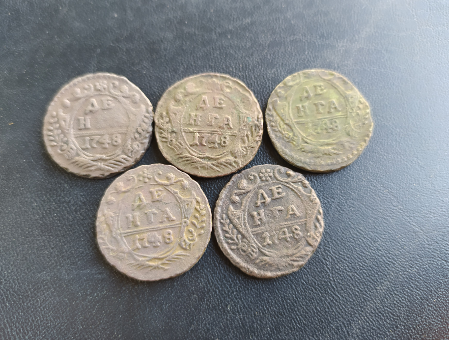 Сегодня в одном своем давно заброшенном альбомчике обнаружил, что у меня имеется аж пять денег 1748 года. В альбом я давно не заглядывал по простой причине - там нет ничего ценного и интересного. Но неужели при большом количестве разновидностей денег среди этих монеток нет ничего ценного? Если заглянуть в один популярный каталог монет, то можно увидеть, что тираж денег 1748 года составлял почти 77 миллионов экземпляров. Я понятия не имею, насколько можно верить этим сведениям, но я бы увеличил данный объем раза в три, так как прекрасно представляю, в каком количестве эти монеты встречаются как в огородах, так и в полях. Какой-то отличительной нумизматической стоимостью они явно не отличаются. Если заглянуть в другой популярный каталог по монетам, то можно увидеть, что с годом 1748 чеканилось три вида монет. Определить их можно по орлам и их хвостам. И вот это самый затруднительный момент в определении разновидностей. Всё дело в том, что для точного определения профиль орла должен