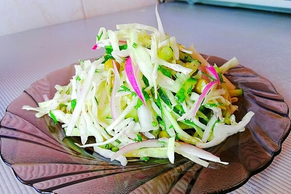 Этот салат из свежей капусты без майонеза и уксуса. Без мясной составляющей, думаю многим этот рецепт понравится. Ингредиенты: