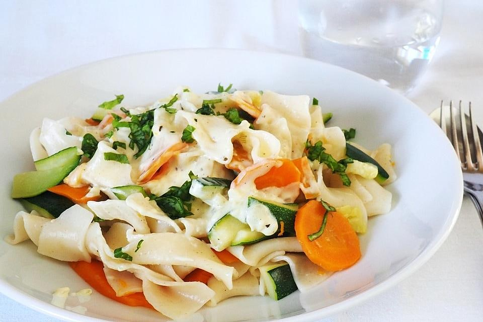 Предлагаю продолжить миссию «съешь кабачок — не дай ему захватить вселенную». И сегодня на очереди рецепт пасты с кабачком и морковкой. Ну и сливочным сыром, разумеется. Легкое, сытное и достаточно летнее блюдо, которое готовится очень быстро. Понадобится: Как готовим: Макароны отвариваем. Морковку и лук нарезаем на небольшие дольки, близкие по форме. Отвариваем минут 5-10 — чтобы овощи приобрели мягкость, но не превратились в кашу. Лук режем мелкими кубиками, чеснок — рубим. Разогреваем на сковороде пару ложек сливочного масла и обжариваем в нем сначала лук (до полупрозрачности), а потом — чеснок. Деглазируем овощным бульоном, даем ему закипеть, а потом распускаем в нем сыр. Солим, перчим, при необходимости загущаем мукой (но по-моему, этого лишнее, если взяли хороший сыр). Дальше два варианта: макароны и овощи можно выложить в сковороду к соусу и прогреть вместе, а можно собрать блюдо полностью на тарелке — так оно выглядит привлекательнее. Ну и не забудьте посыпать зеленью.