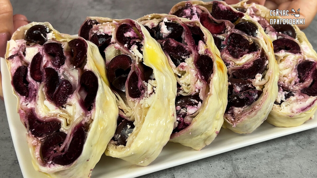 Рулет получается такой вкусный, что невозможно остановиться только на одном кусочке и рука сама тянется еще за кусочком. А приготовить его очень просто и быстро, и даже тесто не нужно замешивать. Как готовить: К творогу добавляю яйца и сахар. Пробиваю погружным блендером, масса должна получиться похожая на детский творожок. Из черешни вынимаю косточку. Черешню можно заменить и на вишню, если будете брать вишню, выберите ту, что по мясистее. На лаваш выкладываю творожную начинку и равномерно ее распределяю, оставляя края, чтобы можно было завернуть рулет. Сверху выкладываю ягоды. Загибаю края лаваша, и аккуратно заворачиваю лаваш в рулет. Соединяю в миске яйцо и сметану. Перекладываю рулет в форму на бумагу для выпечки и смазываю. Выпекаю 25 минут при температуре 180°С. Рулет получается невероятно нежным и очень, очень вкусным. Ингредиенты: Смазать: Приятного аппетита! 👌 Как вам такой рецепт? Жду Вас в комментариях! Подписывайтесь на мой канал "Сейчас Приготовим" чтобы не пропустить но