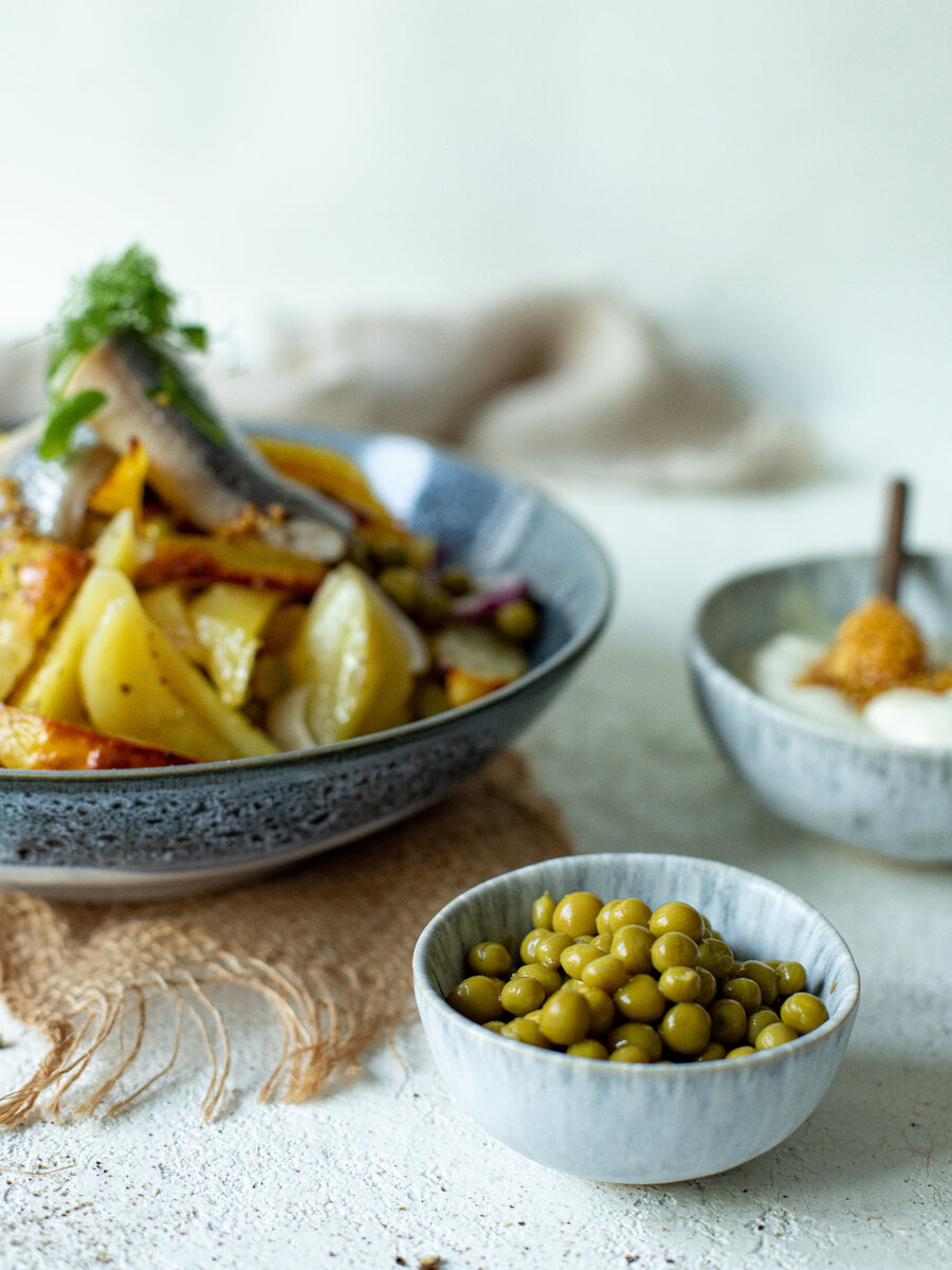- Сельдь нарезаем крупными кусками. Готовый картофель смешиваем с горошком, выкладываем сверху сельдь и тонко нарезанный лук.