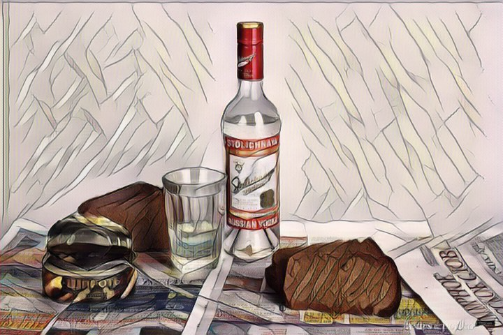 Стол мог бы послужить хорошей композицией для натюрморта, но идиллию нарушала, переполненная окурками, пепельница. Она стояла ровно на середине столешницы между водкой и кабачковой икрой. Пара окурков выпали из нее и безобразно лежали на цветастой клеенке заменявшей скатерть.