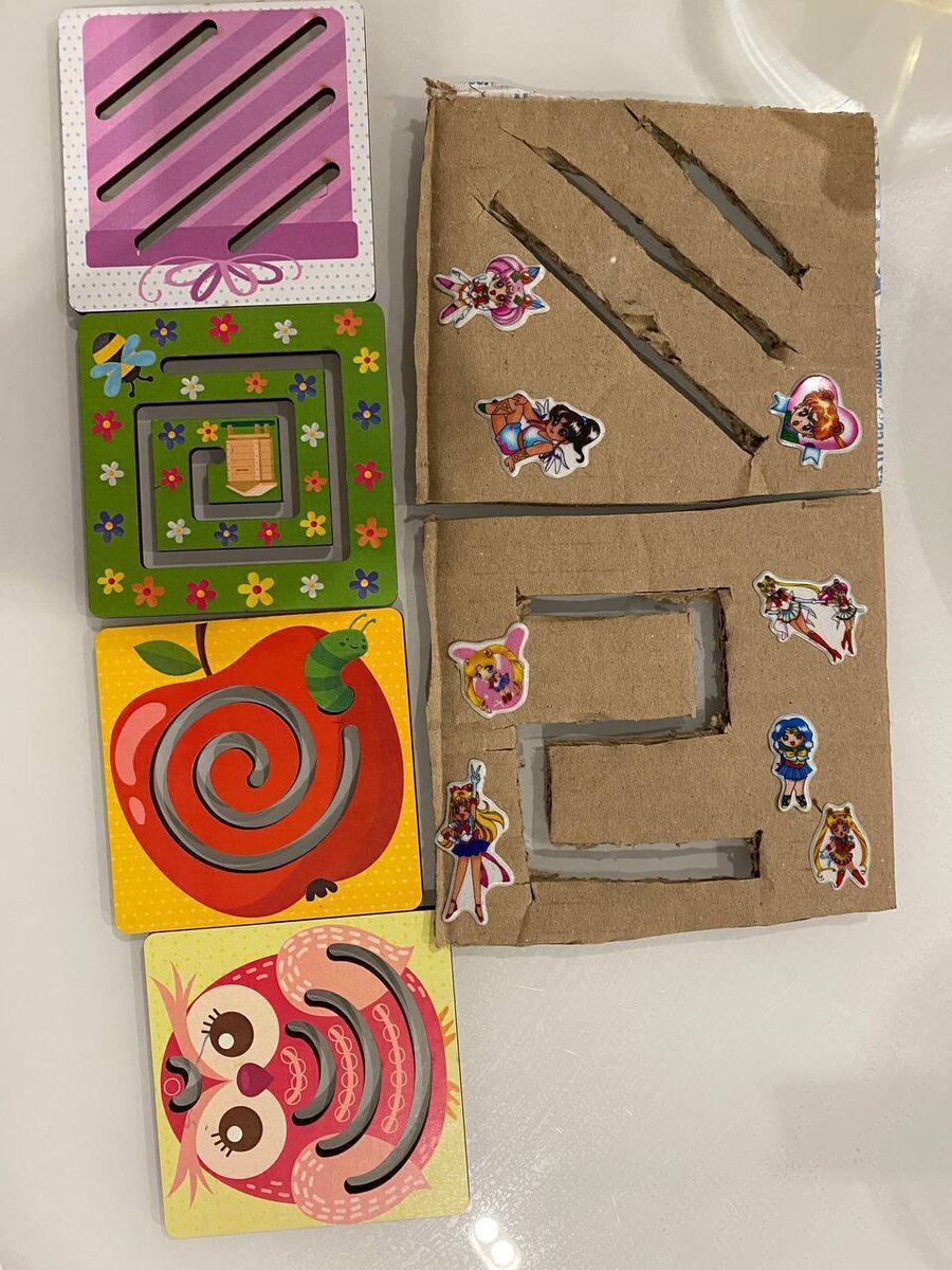Доски для развития межполушарных связей – это развивающие пособия, предназначенные для стимуляции работы обоих полушарий головного мозга. Выполняя упражнения одновременно обеими руками, можно добиться синхронной работы обоих полушарий мозга, что положительно влияет на развитие мышления, памяти, воображения, внимания, речи. Нам потребуется плотный картон и канцелярский нож, наклейки для украшения. Сначала ребенок пробует водить по лабиринту пальчиком одной руки: передвигать бегунок, катать шарик. Потом двумя руками сразу. Сложность упражнений постепенно увеличивается. Одинаковые и одновременные действия двумя руками синхронизируют работу полушарий мозга. Получается, что занятия с дидактическим лабиринтом согласуют их между собой и объединяют, а это: - развивает мелкую моторику; - полезно для запуска речи; - улучшает координацию движений и зрительное восприятие; - повышает обучаемость и получение новых навыков; - улучшает восприятие информации, память и логику; - формирует стрессоус
