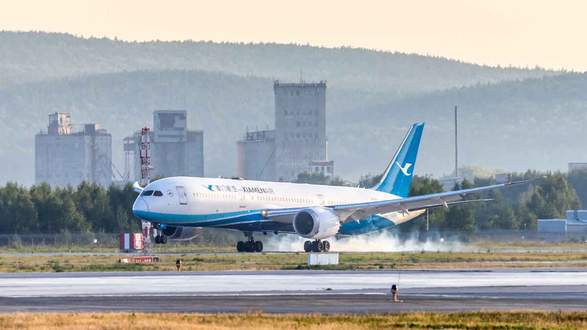 Вчера нам в Кольцово снова прилетел Boeing 787-9 Dreamliner, китайской авиакомпании Xiamen Airlines. Это уже второй визит Дримлайнера этой авиакомпании в наш порт, первый раз он прилетал дней десять назад, но борт тогда был другой, всего в парке авиакомпании двенадцать ВС это типа (ну не один же Дримлайнер на весь Китай :) В прошлый раз из-за неожиданности рейса я его снимал под забором, вчера мы вместе с пресс-службой аэропорта выбрались на перрон. Под забором его снимали наши коллеги, на следующем фото видны их фигуры в районе передней стойки шасси. При длине фюзеляжа 63 метра, размах крыла составляет 60 метров, площадь 325 квадратных метров. Самолет оборудован двумя двигателями General Electric GEnx-1B74 (General Electric Next Generation) - у двигателя изогнутые композитные лопасти со стальным покрытием передней кромки, диаметр вентилятора составляет 2,82 метра. Степень двухконтурности двигателя составляет 9,1 (соотношения обтекающего воздуха к проходящему сквозь камеру сгорания).