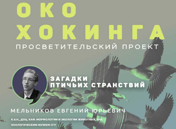 Лекторий «Око Хокинга» – это научное сообщество Саратова, благодаря которому наука становится ближе и доступнее для каждого. Молодые учёные Саратова, а также приглашённые спикеры из других городов рассказывают о современных научных достижениях, собственных исследованиях и объясняют сложные темы простым языком. Наши учёные тоже регулярно становятся спикерами. Напомним о некоторых выступлениях. К слову, организаторы проекта – тоже из СГУ. Сотрудники Саратовского университета ежегодно выступают с научными лекциями, и мы напоминаем про тех, кто выступал в прошлом учебном году: ►Евгений Юрьевич Мельников – кандидат биологических наук, доцент кафедры морфологии и экологии животных, заведующий зоологическим музеем СГУ. Лекция «Загадки птичьих странствий» Как птицы находят дорогу к местам гнездования и зимовок? Как происходит изучение миграций птиц и их навигационных способностей? На эти и другие вопросы по теме миграции птиц ответил Евгений Юрьевич. Ссылка на видео- и аудиозапись лекции. ►