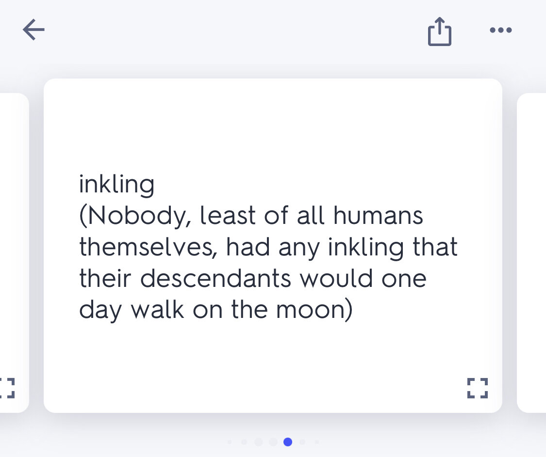 Привет, друзья! Сейчас покажу вам, как из приложения Quizlet выжать максимум пользы и оформить карточки так, чтобы с ними было легко и приятно работать. Сразу к сути - важен контекст. То есть, в каждой карточке важно видеть пример употребления слова или фразы, которую мы учим. Таким образом нашему мозгу легче понять, как использовать слово в речи, как построить с ним своё предложение. Делаем так: Покажу на примере своих карточек, которые я делала, когда читала книгу Sapiens. Это лицевая сторона карточки. Сверху слово, которое я хочу выучить - inkling. Ниже пример употребления этого слова в предложении, взяла его прямо из книги. Это оборотная сторона карточки, сюда я добавила определение на английском. В чем суть - на первых этапах, конечно, без перевода не обойтись, но чем дальше вы продвигаетесь, тем полезнее уходить от перевода к определениям. Таким образом вы убираете фильтр русского языка и нарабатываете навык формирования в уме того, что хотите сказать сразу на английском. Так р