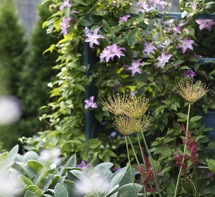 В августе мой сад розовый. Так уж вышло, что почти все цветы там разных оттенков розового цвета. Так что сегодня все фото будут наполнены разными оттенками этого цвета. Что поделаешь? Я его люблю! Начнем, пожалуй, с красавицы, которая только что показалась во всей красе - древовидной гортензии розового цвета. При роспуске ее бутоны малиновые, а раскрываются в серебристо-розовые цветки. Множество цветков на разной стадии роспуска создают розовые облака, как зефир на ветках. Растет она у меня в тени, но цветет неплохо. Ветки подвязываю, а сорт - Pink Annebelle, далеко не самый лучший, кстати, из современных. Здесь она идеально сочетается с астильбой (в частности, и по срокам цветения!). А рядом на террасе - крупнолистная. Кстати, помните, недавно делала цветник? Вот как выглядит левая часть уже сейчас. Начинают цвести флоксы... Это совсем старый сорт, доставшийся мне по наследству... У домика - розовый клематис. Тут виднее... Ну а в саду за домом тоже много розового. Вот вдалеке та, чт