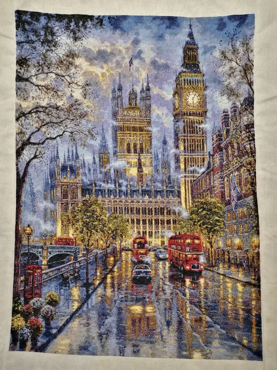 Хочу поделиться своей самой грандиозной работой. Финиш этого года. "Небо Лондона" от Химеры. Это моя первая работа от этого дизайнера. Меня в ней привлекло именно небо. Влюбилась с первого взгляда. Купила схему почти сразу, долго не раздумывала. Размер работы 77х55 см, 350х470 крестиков. В работе используется 50 цветов ниточек и 6 блендов. Вышивала на 16 каунте крестиком в две нити мулине СХС. Нитки и канву приобретала отдельно. Вышивка шла непросто. Много одиночек, постоянно приходилось менять ниточку. Я старалась чередовать вышивку одиночек и зашивку одним цветом, хотя таких учасков в работе очень мало. 2/3 работы это сложные участки. Небо вышивалось намного легче. На нем можно было отдыхать. Поэтому в верхней части работы процесс пошёл быстрее. Очень красивые оттенки синих и голубых цветов. Несмотря на все сложности, очень довольна, что взялась за эту работу. Вышивала 2,5 года понемногу, чередуя с другими работами. Результат получился просто потрясающий!
