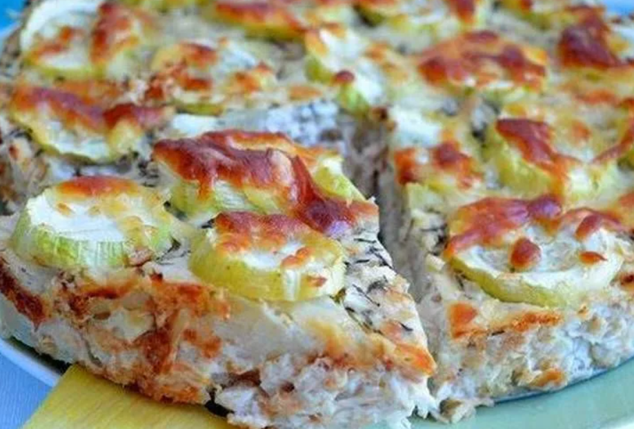 Легкий куриный пирог Сочный воздушный пирог, не требует никаких особенных ингредиентов, все продукты наверняка есть у хозяйки под рукой Нам понадобятся продукты: 400 г. куриной грудки, 1 ст. пшеничной муки, 2 ст.л.сметаны, 1 молодой цукини, 2 яйца, 1 головка репчатого лука, 2 зубчика чеснока, 1 ст.л.панировочных сухарей, 150 мл. молока, 100 г. сыра твердых сортов, 1/2 ч.л.разрыхлителя, смесь перцев, соль, паприка, приправа для курицы кладем по вкусу, Готовим: 1. Промытую куриную грудку нарезаем на кусочки, натираем их солью с добавлением мелко рубленного чеснока и перца. Оставляем на полчаса, чтобы мясо пропиталось. Луковицу очищаем, промываем и мелко рубим. Кабачок промываем, высушиваем бумажным полотенцем и нарезаем кольцами 2. Затем обжариваем кусочки курицы на раскаленной сковороде до образования румяной корочки. 3. В чаше блендера взбиваем яйца с солью и молоком, постепенно подсыпаем просеянную муку с разрыхлителем и любимые приправы. У нас должно получиться тесто средней густоты,