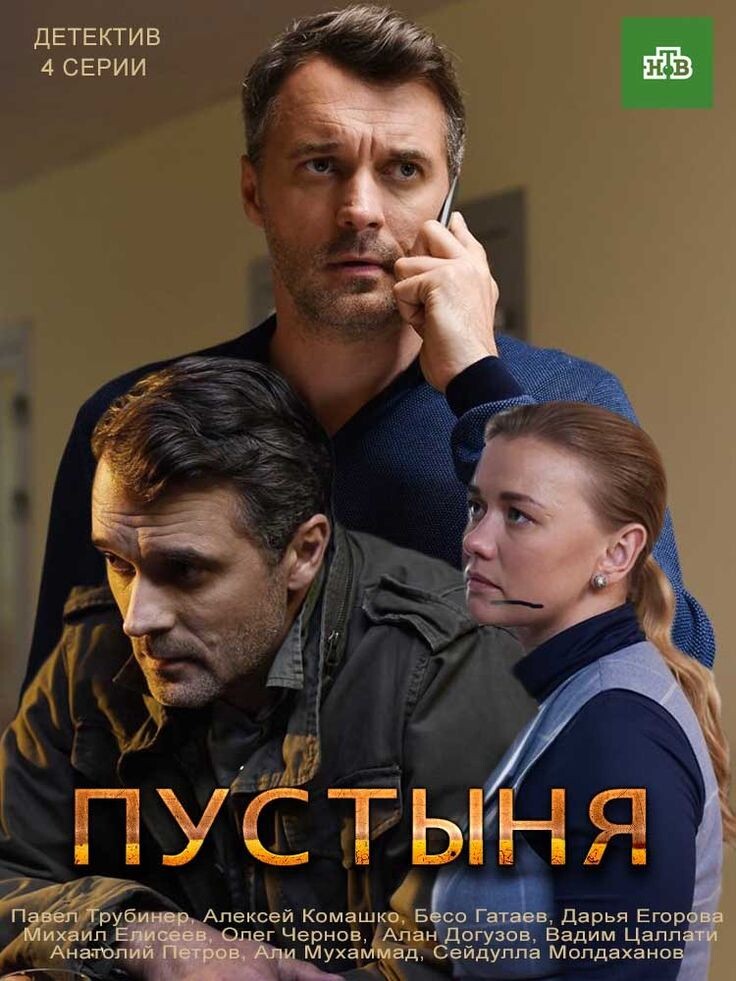 ИНФОРМАЦИЯ О ФИЛЬМЕ: Название :ПУСТЫНЯ (2019) Режиссер Мурад Алиев Сценаристы Михаил Баркан, Виктор Будилов Оператор Ростислав Гассельблат Композитор Анатолий Зубков Художник Михаил Гаврилов Продюсеры Виктор Будилов, Дмитрий Сошников (креатив.), Дмитрий Кузьмин (III) (иcп.) Актеры Павел Трубинер, Алексей Комашко, Бесо Гатаев, Дарья Егорова, Михаил Елисеев, Олег Чернов, Алан Догузов, Анатолий Петров, Илья Матюшин, Али Мухаммад, Сейдулла Молдаханов, Самвел Мужикян, Алексей Манцыгин, Тимур Базинский, Фаридуншо Рахматуллоев, Марина Денисова, Тимур Ворохов, Евгений Ганелин, Артём Кувшинов, Файзулло Руштов, Сайдо Курбанов, Олег Абалян, Владимир Крючков, Олег Ерёмин, Сергей Галич Производство Компания «Гамма продакшн» по заказу канала НТВ Премьера 24 февраля 2019 (НТВ) Cерий 4 Жанр драма, боевик, детектив, приключения Описание : Полевой командир Масуд планирует произвести масштабный теракт, сравнимый или даже превосходящий атаку 11 сентября. На вооружении армии Саулейна (небольшого государс