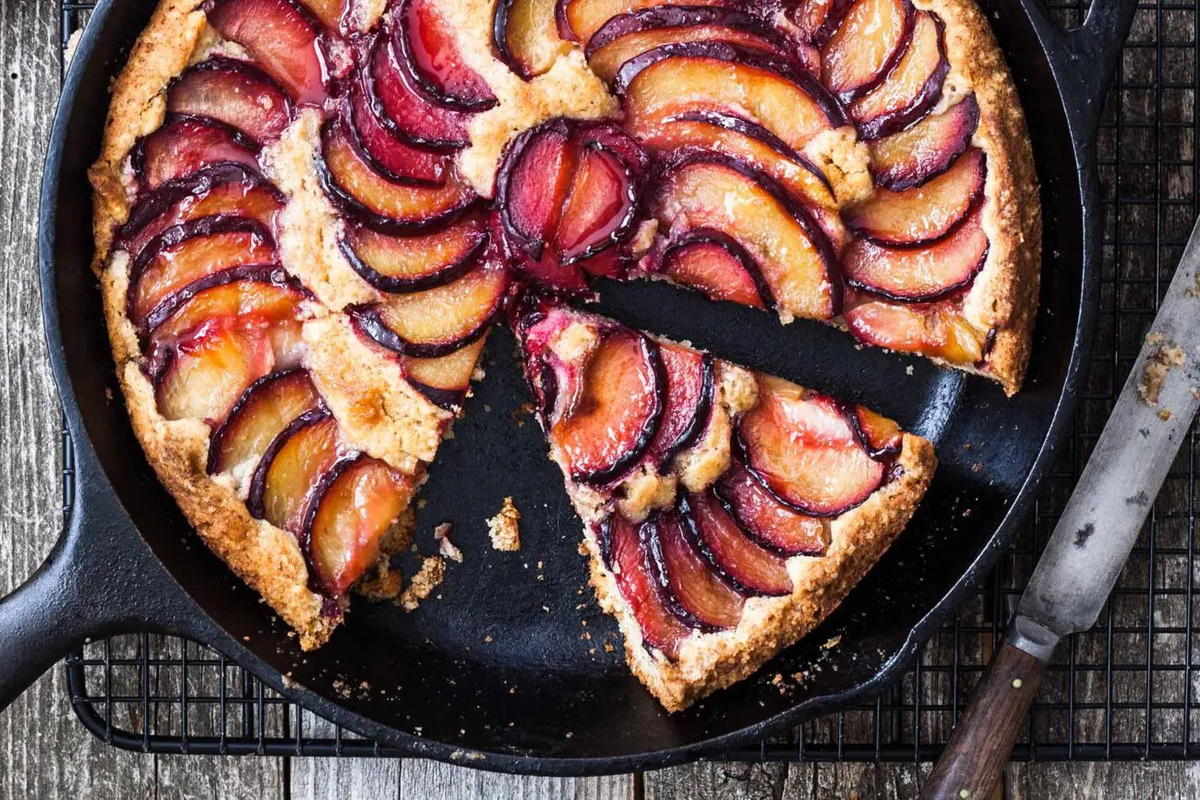Этот пирог из слив с грецкими орехами так же прост, как и великолепен на вкус. Он заставит вас взять небольшой перерыв, чтобы вдоволь им насладиться! Сливы будто специально созданы для выпечки – сочные, сладкие, с легкой, еле уловимой кислинкой, хорошо сохраняют форму, а в сочетании с рассыпчатым тестом и измельченными грецкими орехами они вдвое прекраснее! В этом рецепте вы можете использовать любые сорта сливы. А для приготовления теста вам потребуется всего несколько минут! Ингредиенты: сливочное масло: 120 гр. нарезанного ломтиками + для смазывания формы сливы: 5-6 шт. (около 450 гр.) твердые грецкие орехи: 3/4 стакана сахарный песок: 3/4 стакана яйца: 2 шт. цедра лимона: из 1 лимона ванильный экстракт: 1 ч.л. мука: 1 1/4 стакана разрыхлитель: 3/4 ч.л. соль: 1/8 ч.л. тростниковый сахар: 2 ст.л. мёд: 2 ст.л. (по желанию) Способ приготовления: 1. Разогрейте духовку до 180ºС. Обильно смажьте маслом жаростойкую сковороду с термостойкой ручкой или форму для выпечки (25 см.). Сливы ра