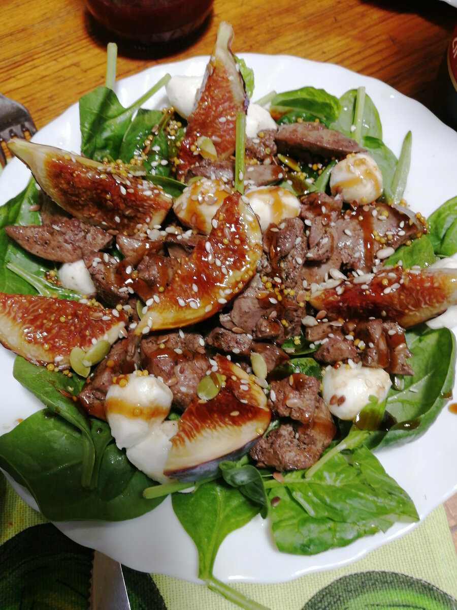 Вкусный салат с куриной печенкой и инжиром.
