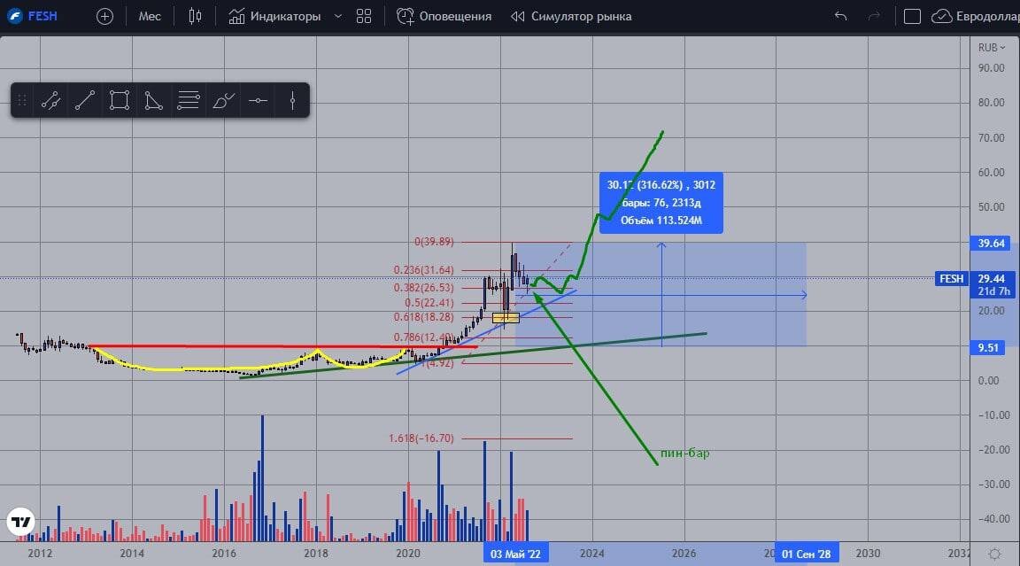 Экономика России переориентируется на Восток. А это в том числе и поставки товаров. А поставки товаров - это морские порты. Ну как тут не взглянуть на акции Дальневосточного Морского Пароходства (ДВМП, #FESH)? 📈На графике вижу: ✅Чашку с ручкой - которая уже начала отработку, но не закончила ❗️ Всем, кто ржал над Чашкой вчера - посмотрите на результат, рост +200% по текущим ценам, а был +300% с лишним, если ориентироваться на исторический максимум. ✅Отработана коррекция по Фибо (выделено желтым) ✅Бычья свеча (пин-бар) ✅Растущий тренд ❗️Все вышеописанное заставляет предполагать и допускать достижение таких уровней: 40 и 60. И даже это не предел, но это уж совсем далеко заглядывать нужно - пока не буду Понятно, что откаты и коррекции возможны. Риски, а значит необходимость риск-менеджмента и мани-менеджмента никто не отменял. Но, тем не менее, среднесрочный взгляд на акцию вот такой. #FESH