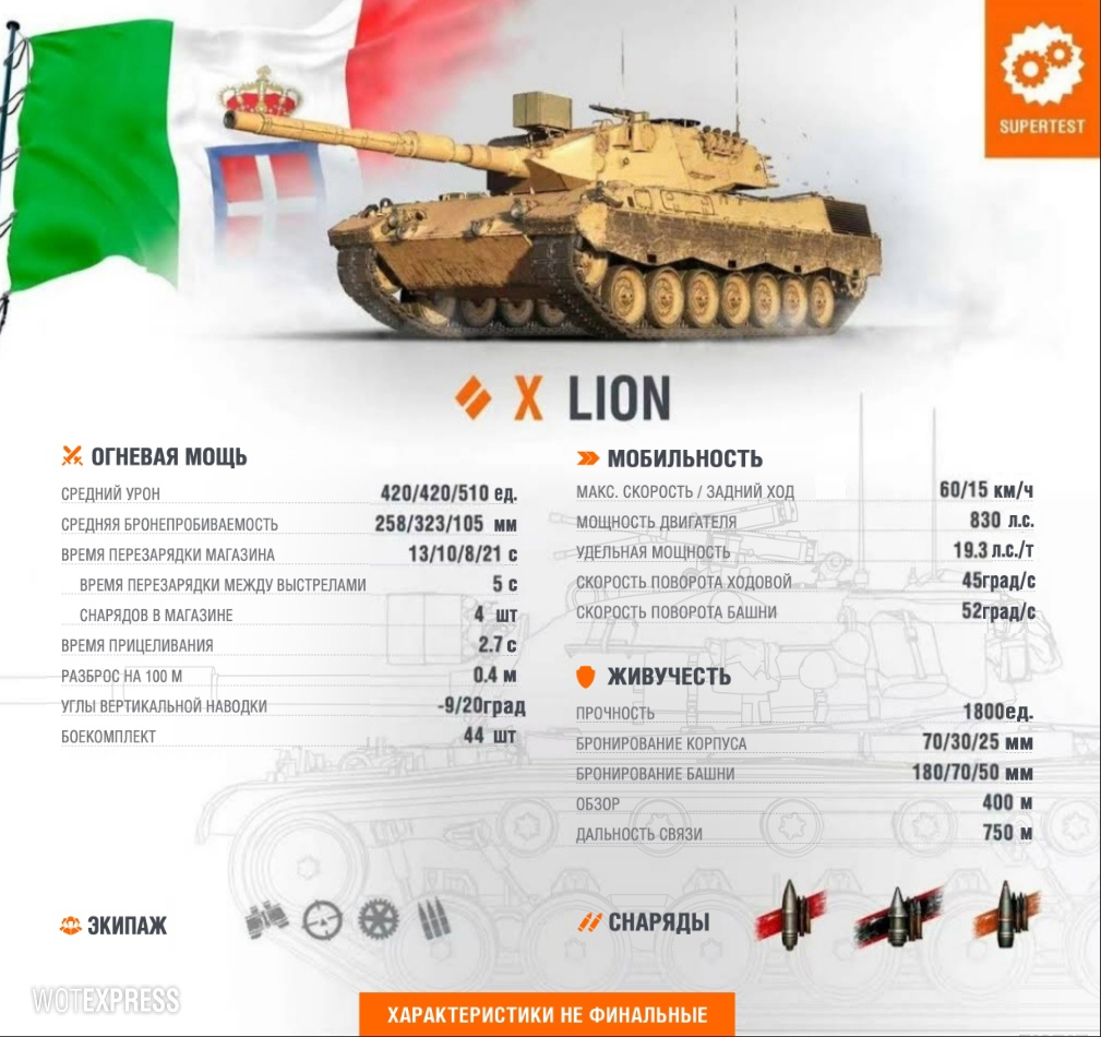 За что будет — возможная награда за событие/ивент. Ждём Lion на этой неделе на супертесте. Так как Lion с механикой, показываем его характеристики орудия отдельно: Огневая мощь: * Все ТТХ указаны без командирского бонуса. ** Описание отсутствует. Экипаж 4 человека: Командир (Радист); Наводчик; Механик-водитель; Заряжающий.
