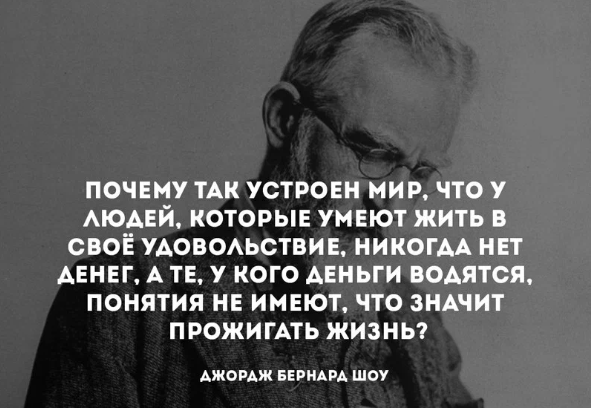 Встречая вопросы, мы хотим знать на них ответы. Если конкретных ответов нет - мы генерируем самостоятельно. Не всегда это так работает, но так устроен мозг человека. И порой люди веками не могут ответить на какой либо вопрос, а где-нибудь в наше время на него находится достаточно простой ответ. Вот и Джордж Бернард Шоу задал вопрос, на который мы попробует ответить: Почему так устроен мир, что у людей, которые умеют жить в своё удовольствие - никогда денег нет, а те, у кого деньги водятся - понятия не имеют, что значит прожигать жизнь??? На самом деле тут стоит смотреть в корень проблемы. А точнее в саму суть. Ведь те люди, которые часами заморачиваются добывая эти деньги, вычисляя свою целевую аудиторию, строя бизнес план и работая без выходных как таковых не только знают цену деньгам, но и не готовы проводить своё время без смысла, ведь знают, что могут потратить его целенаправленно на своё дело. Те люди, которые с самого начала своей жизни мало о чём задумываются в долгосрочной пер