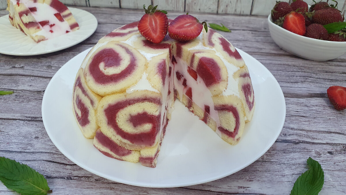 Всем привет👋 В этой статье я расскажу как приготовить нежный, воздушный, диетический торт из бисквитного рулета с клубничным джемом и лёгкого творожного мусса. Торт без муки и без сахара! ✔️ БИСКВИТ : ✔️ МУСС : ✔️ ДЖЕМ : ВЕС торта: 1080 гр КБЖУ на 100 гр: 100,21/6,98/4,14/8,19 РАЗМЕР миски для оформления торта: верхний диаметр 20 см, нижний - 9 см, высота - 9 см, объём - 1,5 л ПРОЦЕСС ПРИГОТОВЛЕНИЯ : Приготовим джем. В чашу блендера поместить клубнику (если ягода замороженная, то предварительно разморозить), кукурузный крахмал и подсластитель. Пробить в пюре. Перелить в сотейник. Варить на среднем огне, постоянно помешивая, до загустения массы. Огонь выключить, накрыть пищевой плёнкой в контакт и дать полностью остыть. Для ускорения процесса можно поставить сотейник в миску с холодной водой. Приготовим бисквит. Белки отделить от желтков. К желткам добавить подсластитель и просеять крахмал. Перемешать венчиком. Белки взбить с щепоткой соли до устойчивых пиков. В два этапа ввести
