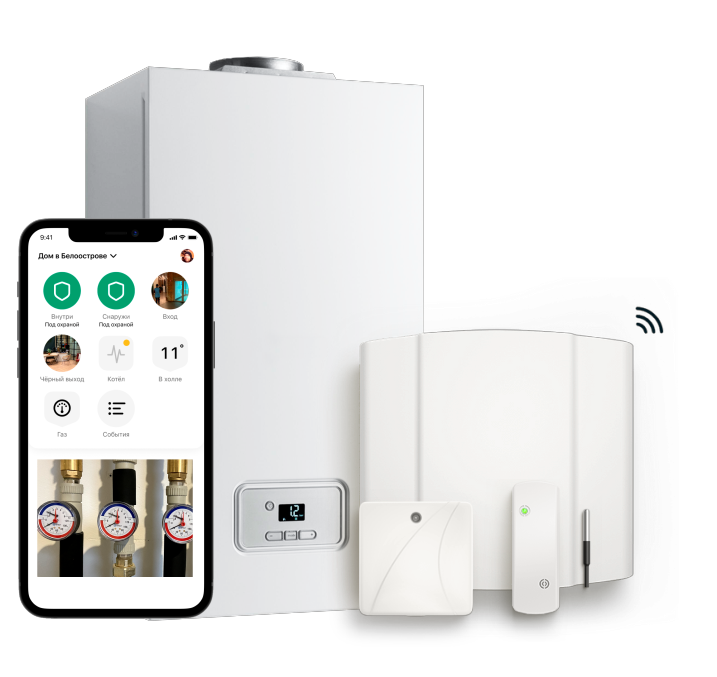 Система Умный котел — это набор оборудования, который помогает вам управлять и контролировать температуру и работу котла отопления в вашем частном доме, пока Вы на работе или в поездке. Система состоит из: Как это работает? Центром управления служить контрольная панель – она отвечает за автоматику и связывает все устройства в единую сеть. Беспроводное реле подключаются к котлу отопления через два сухих контакта, что позволяет дистанционно управлять котлом через мобильное приложение. В мобильном приложении можно настроить несколько «сценариев» включения и выключения котла: - при взятии и снятии с охраны (т. е. когда уходим и приходим домой); - по расписанию (ночь, будние дни); - по датчику температуры (когда дом начинает выстужаться). Датчик температуры устанавливается в любом помещении дома и используется для настройки сценариев автоматики. Он соединяется с контрольной панелью и передает показания температуры в приложение в режиме реального времени. С помощью датчика можно настроить ре