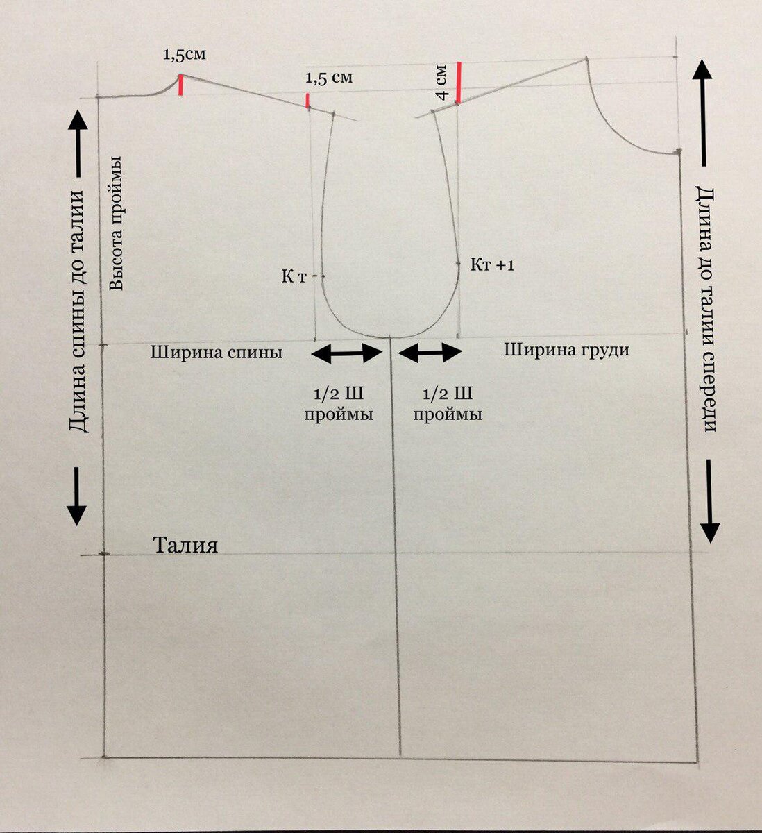 Всем доброго времени суток. Я долго думала, что бы такого полезного опубликовать. Что бы пригодилось всем и в любое время года. И вот меня осенило - мужская футболка, это то что надо. У каждой из нас есть или муж, или брат, или сын. Футболка из трикотажа станет приятным подарком. Поэтому надеюсь эта статья пригодится каждой рукодельнице. И так - построение выкройки мужской футболки Для построения нам потребуется следующие мерки: Рост - 184 см Обхват груди (Ог) - 116 см Обхват бедер (Об) - 120 см Длина рукава - 64 см Ширина рукава по низу - 26 см Мерки я взяла стандартные из размерной таблице. Вы можете подставить мерки своего мужчины. Длина изделия может быть любой, на ваше усмотрение. Или можно отмерить от талии 20 - 25 см. Сделаем необходимые расчеты Ширина горловины сзади - Сг (полуобхват груди) : 10 + 3 = 8,8 см Высота проймы сзади - Ог : 8 + (10 - 12 см) = 24,5 см Длина спины до талии (Дтс) - 1/4 роста = 46 см Длина до талии спереди (Дтп) - Дтс + 3,5 см = 49,5 см Ширин