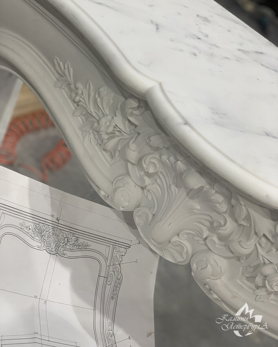 На нашем сайте мы специально сделали сортировку, где можно посмотреть камины в наличии, с возможностью сгруппировать как по стилям, так и по цене. К сожалению, те, что в работе в настоящий момент, показать пока невозможно. Производство резного камина – длительный процесс, занимающий от нескольких месяцев и в редких случаях – до нескольких лет. Начиная с подбора камня, его правильного раскроя, распиловки на необходимые детали согласно проекта, обработку этих деталей и подготовку их непосредственно к работе мастера – резчика. Могу сказать, что бывают периоды, как это случилось этой весной, когда из наличествующих всегда 50 каминов, осталось только 25. И резных среди них немного. Поэтому показываю в нескольких постах этого месяца, что у нас в работе на заводе, на сегодня. Может быть, именно для вас эта информация окажется полезной. Это будут очень красивые камины. Итак, камин в работе. Настоящий рокайльный камин, датируется 1730 годом. Точная копия. Мрамор Statuario, из наших «запасов». «