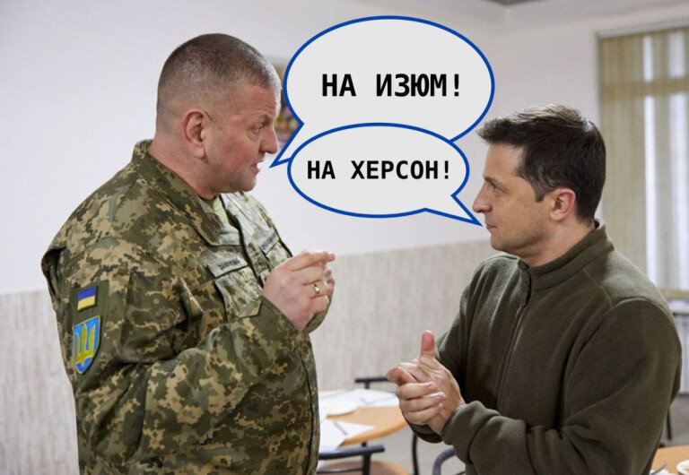 «Наш источник в Офисе президента рассказал, что Генштаб перелагает использовать новое направление для контрудара, так как операция #Битва_за_Херсон на данном этапе может превратиться в пустую трату резервов ВСУ. Пустой политический пиар министра обороны привёл к тому, что группировка российских войск в Херсоне была увеличена в три раза. Из трёх разработанных кампаний, Залужный предложил Зеленскому вернуться к Харьковскому контрнаступлению, что позволит отодвинуть фронт и ударить с фланга российскую группировку на восточном фронте. Необходимо сдержать продвижение российских войск на Донбасской дуге, организовав контрнаступление на Изюм, что позволит сорвать наступление РФ на Славянск», – телеграфирует украинский Телеграм-канал Резидент.
