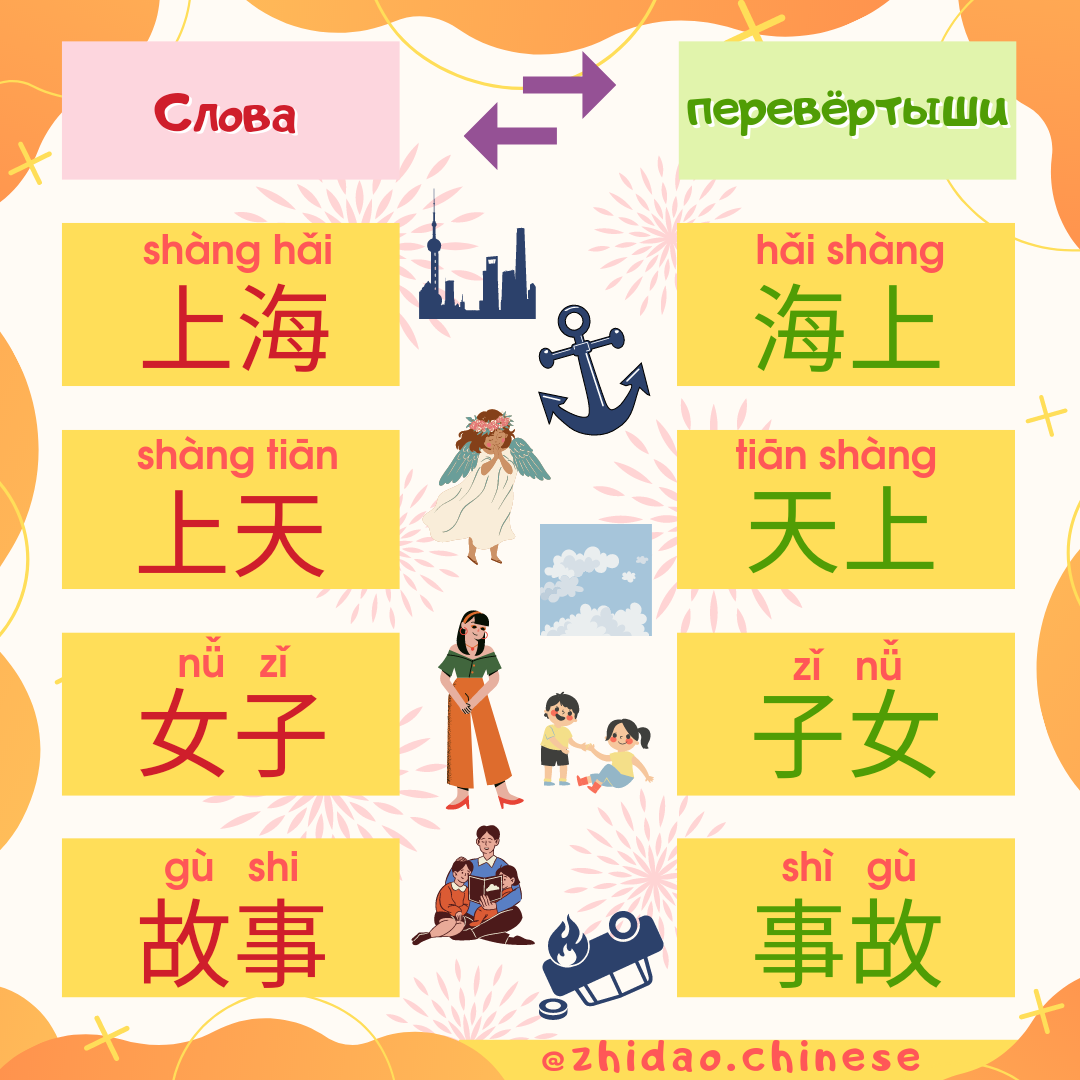 #zhidao_синонимы Сегодня мы еще раз разбавим нашу подборку словами-перевертышами! Если в таких двусложных словах поменять иероглифы местами, то получится новое слово, смысл которого может разительно отличаться 🔁 🔊 Открывайте видео и включайте звук, чтобы услышать, как произносится каждое слово! https://zen.yandex.ru/media/id/6229c4732ee12c3dbfb56d3b/slovaperevertyshi-3--62f46fafe9937447ec266f21 🌁 上海 shànghǎi Шанхай 🚢 海上 hǎishàng в море, на море 👼 上天 shàngtiān всевышнее Небо, вышние Небеса ☁️ 天上 tiānshàng небо; на небе, в небе 🧍♀️ 女子 nǚzǐ женщина, женский 👨👩👧👦 子女 zǐnǚ сыновья и дочери, дети 🧚♀️ 故事 gùshi рассказ, история, сказка 🚨 事故 shìgù инцидент, происшествие, несчастный случай 📝 Ссылка на карточки Quizlet для изучения новых слов: https://quizlet.com/_btkery?x=1qqt&i=2r5snr 📚 Хотите, чтобы Вы или Ваш ребенок заговорили на китайском? Напишите нам для записи на групповые / индивидуальные занятия! 🎓 #china #chinese #школакитайского #китайский #москва #язык #