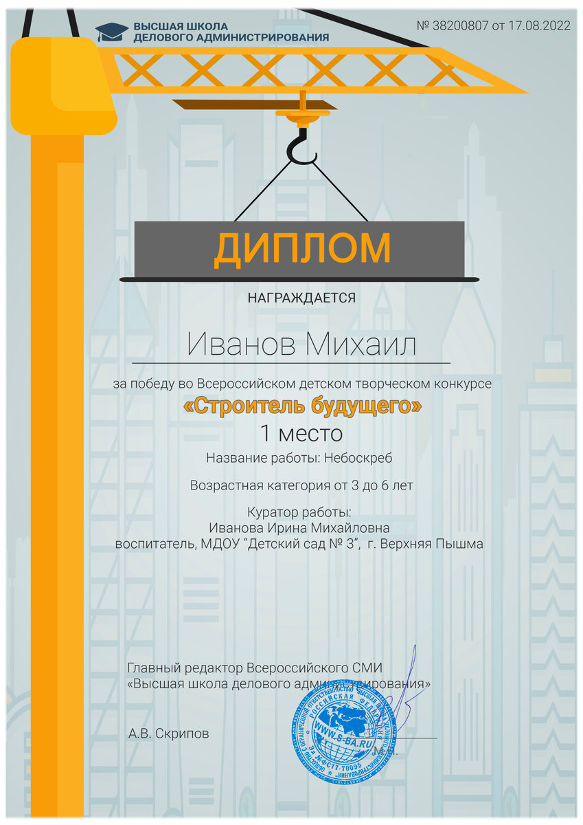 Все детские творческие конкурсы мы проводим БЕСПЛАТНО. Кроме того, на ресурсе s-ba.ru мы размещаем бесплатно электронные наградные документы (дипломы и благодарственные письма). Электронные наградные документы размещаются на сайте в размере (разрешении) 1000х707 пикселов, в формате jpg/jpeg. Бесплатные наградные документы доступны для скачивания в каталоге «Результаты» в течение 2-х месяцев со дня публикации в каталоге