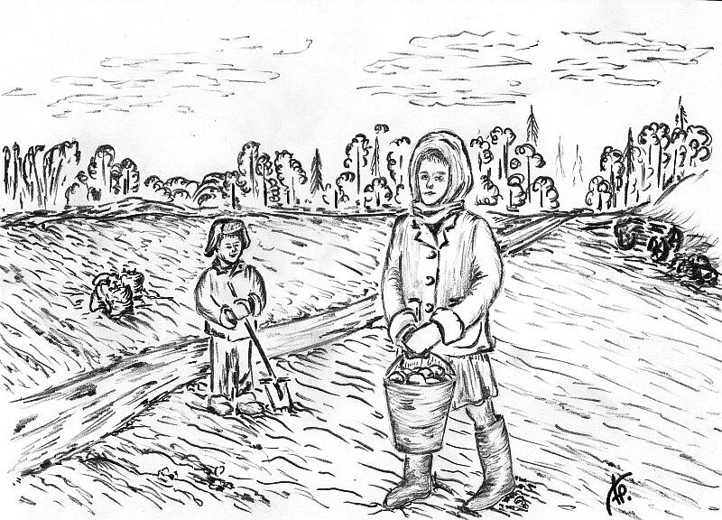 Такое было, что и совсем без продуктов оставались. Мама делала заваруху: муку зальет кипятком и по тарелкам, редко в тарелку масла постного или молока немного добавит. А когда в котелке картошку отварит, на стол вывалит – вот и вся еда. На полях после уборочной собирали турнепс, кое-где картошку найдешь. Летом ягоды, грибы, луговой чеснок. В вересушки бегали–большой вересковый лес был, – там ягоды собирали.