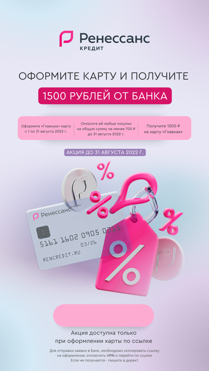 Дебетовая карта «Главная» Оформите карту до 31 августа и получите 1500 рублей от банка В акции могут принять участие клиенты без действующего продукта банка. До 9% годовых на любой остаток Откройте счёт «Ренкопилка» для накоплений Кэшбэк 1% За все повседневные покупки Бесплатное обслуживание 0 ₽ — комиссия за обслуживание Бесплатное снятие наличных Снимайте наличные в любых банкоматах без комиссий до 300 000 ₽ в месяц Оформите заявку на сайте или в мобильном банке — не выходя из дома