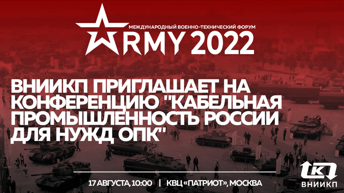 17 августа в рамках научно-деловой программы Международного военно-технического форума "Армия-2022" пройдет конференция "Кабельная промышленность для нужд ОПК". Организатор встречи выступит ОАО "ВНИИКП". В рамках мероприятий научно-деловой программы будут обсуждаться вопросы государственной политики и межведомственного взаимодействия в области обороны государства, а также перспективные направления развития военно-технической сферы. Место проведения: КВЦ "Патриот", Московская область, Одинцовский городской округ, г. Кубинка, Главный выставочный павильон, конференция зал А5 Приглашаем всех желающих присоединиться к конференции. >> Приобрести билет и зарегистрироваться на мероприятие можно на официальном сайте мероприятия "Армия-2022" << Всего, в рамках "Армия-2022" запланировано проведение более 260 мероприятий по приоритетным вопросам развития Вооруженных Сил Российской Федерации, оборонно-промышленного комплекса России и международного военно-технического сотрудничества, которые при
